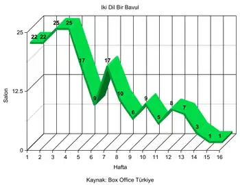 - عندما أخذ مكاناً في الصفوف المحددة في قوائم الأفلام التركية وكل الأفلام عام 2009 ، تم تناوله خلال عشرة أسابيع فقط . الفيلم النتبقى في العرض في حصيلة 25 أسبوع نقل لعام 2010 مع الآخرين المتبقين في 15 أسبوع .[70][71]