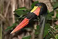 ويتميز بمنقاره الملون الجميل فهو خليط بين الأحمر والأصفر والأسود . وهي مثل معظم اللقالق فهي طيور صامتة ولاتطير إلا ورأسها ممدودة إلى الأمام ولاترجعه إلا الخلف كطيور مالك الحزين .