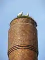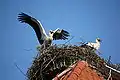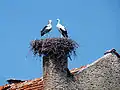 زوجان من اللقلق الأبيض فوق المدخنة.