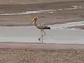 لقلق أصفر المنقار وهو يصطاد الأسماك في المياه الضحلة .
