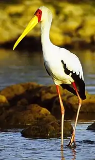 اللقلق أصفر المنقار (Mycteria ibis) ،وهو طائر كبير خواضة من عائلة لقلقية وتتواجد في أفريقيا وجنوب الصحراء ومدغشقر ، وهو لقلق متوسط الحجم ويبلغ طوله 97 سم ووزنه بالنسبة للذكور 2.3 كغ وبالنسبة للإناث 1.9 كغ . ريشه أساسه أبيض مع مع أجنحة وذيل أسوديين .وساقيها لونها أحمر برتقالي بينما الوجه فهو مايميزها فملمسه جميل وهو أحمر اللون بينما المنقار طويل وأضفر يصطاد به الأسماك .
