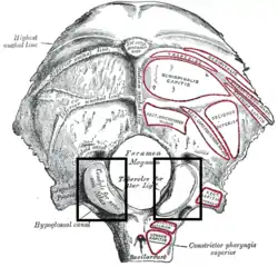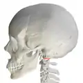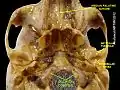 ![]() السطح الخارجي للعظم القذالي. (لقمة المفصل مع فقرة أطلس مؤشرة في أسفل اليسار.) السطح الخارجي للعظم القذالي. (لقمة المفصل مع فقرة أطلس مؤشرة في أسفل اليسار.) | |