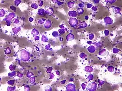 ![]() صورة مجهرية تظهر لمفوما ضخمة بائية الخلايا. صبغة فيلد. صورة مجهرية تظهر لمفوما ضخمة بائية الخلايا. صبغة فيلد. | |