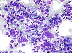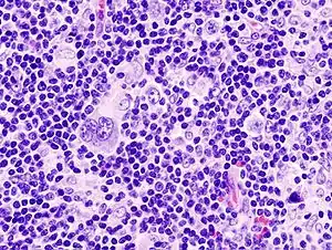 ![]() صورة مجهرية لمقطع في عقدة لمفاوية يبين لمفوما هودجكين (صبغة فيلد) صورة مجهرية لمقطع في عقدة لمفاوية يبين لمفوما هودجكين (صبغة فيلد) | |