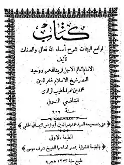 - كتاب: "شرح أسماء الله الحسنى للرازي وهو الكتاب المسمى لوامع البينات شرح أسماء الله تعالى والصفات للإمام الأعظم والعالم الأمجد الأكرم فريد دهره ووحيد عصره شيخ الإسلام فخر الدين محمد بن عمر الخطيب الرازي" راجعه وقدم له وعلق عليه: طه عبد الرءوف سعد، الناشر: المكتبة الأزهرية للتراث، 1431 هـ - 2011 م، ص: 14.