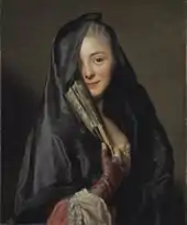 السيدة في الصورة مخفية بشكل جزئي بحجاب من الحرير الأسود و ترتدي تحته ملابس لمناسبة خاصة من الدانتيل الأبيض و الحرير الوردي. كان المسرح خلال القرن الثامن عشر جزءاً هاماً من حياة الطبقات العليا. فكان التأنق و التنكر، و لعب الأدوار الدرامية هواية مشتركة في ذلك الوقت. و يمكن القول أن نساء بولونيا Bologna الإيطالية كانت ترتدي مثل هذا اللباس و الذي يسمى أ لا بولونيز à laBolognaise. تبتسم السيدة بطريقة إغرائية إلا أنها تريد أن تبقى في الخفاء، فهي تظهر فقط جزءاً من وجهها. إن استخدام المراوح اليدوية في ذلك الوقت لم يكن فقط أداة تستعمل في المجتمعات الارستقراطية، بل كانت تستخدم أيضاً لإرسال رسائل سرية سواء في طريقة حملها أو فتحها أو إغلاقها. في لوحة السيدة مع الحجاب قامت المرأة بطي المروحة و الضغط بها على خدها. قد تكون الرسالة التي تريد إيصالها: أنا أحبك.