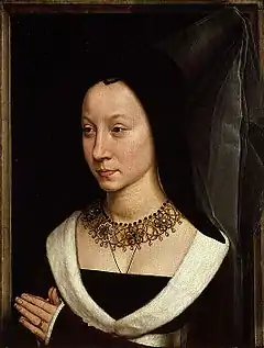 لوحة ماريا بورتيناري، من صنع الفنان الألماني هانز مملينج، والتي يرجع تاريخها إلي عام 1470، بمتحف المتروبوليتان للفنون في نيويورك. وفي عام 1953، قام إروين بانوفسكي بدحض مخططات وادعاءات شون والتي كانت مبكرة قبل أحقية قولها بعشرين عامًا. لاحظ بانوفسكي زي الفتاة يشبه إلي حد كبير الأزياء الخاصة بمدينة بورغندي في أواخر القرن الخامس عشرإلي منتصفه ( 1460- 1470).وقام بمقارنة الغطاء الرأسي الضخم الذي يشبه القبعة التي تستقر علي رأس ماريا بورتيناري وأيضًا الملابس التي خضعت للتذهيب عام 1470 من صنع الفنان هانز مملينج باللوحة الفاخرة المطعمة بالذهب أيضًا والتي وضعت في أربعة أجزاء في بورغندي.[27] في حين أضاف ستارلنج تعليقه الفني فيما يخص التفاصيل الدقيقة للوحة، فصرح في عام 1465بأن الغطاء الرأسي في هذه اللوحة الألمانية يختلف أشد الاختلاف عن قرينتها الأمريكية بنيويورك فكل منها ينتمي إلي نوع مختلف.فيتميز الغطاء الرأسي الأمريكي باستطالة الجانب الخلفي لهذا الغطاء عن غيرها من الأنواع الأخرى، ويبدو أنه كان سائدًا واسع الانتشار بعد بضع سنوات، ولكنه يفتقر إلي اللفة التي يتألف منها هذا الغطاء وأيضًا إلي الطريقة التي يتم لفها بها حيث أظهرت اللوحة الألمانية أنها تلف حول العنق.[9] لاحظ ستارلنج بأن هذه اللوحة قد قامت بتوسيع المجال والعمق الفكري لدي مشاهديها وتوسيع نطاق الإيحاءات ذات العمق الدلالي ومحاولة صياغة التفاصيل في قلب محكم وهذا الذي ميز هذه اللوحة عن قريناتها من لوحات كريستوس الأخرى المبكرة.وعلي هذا الأساس، يُرجح أن هذا العمل قد تم إخراجه علي مشارف انتهاء حياة الفنان كريستوس.[9]