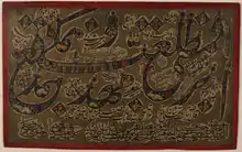 كُتبت الكلمات الكبيرة بخط النستعليق وتملأها الأشكال الزخرفية والحيوانات والأشكال الإنسانية، ويُسمى هذا النمط من الخط الغني بأشكال عديدة گلزار، الذي يعني حرفيا حديقة الورود أو ممتلئ بالورود، وعادة ما يُستعمل هذا النمط في المناطق الداخلية من النقوش المكتوبة بخط نستعليق، وكان خط الـگلزار رائجا في إيران خلال أواخر القرن الثامن عشر وفي القرن التاسع عشر، كتب هذه القطعة الخطاط حسين زارين قلم المعروف باسم حسين ذو القلم الذهبي لحسين خان سلطان، ويرجع تاريخها إلى الفترة المبكرة من حكم القجار في إيران 1785-1925ميلادي، وتحيط الأحرف الكبيرة المكتوبة بخط النستعليق والتي تملأها الأشكال المتكررة صلوات شيعية قصيرة مخطوطة بأحرف مختلفة، وتشمل هذه الخطوط الثلث، والنسخ والنستعليق والشيكاستا، والتوقيع أو الإجاز، والكوفي، وهنالك أيضا جملة منقوشة بالعكس كأنها كُتبت باستعمال المرآة.
