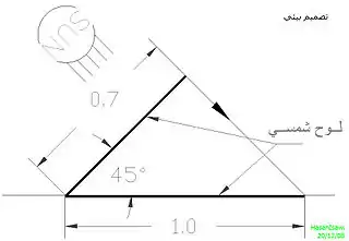 - لكسب أشعة الشمس وليس لتجنبها، الألواح الشمسية لتسخين المياه أو لتوليد الكهرباء يجب أن يتوجهوا للجنوب. وعلاوة على ذلك، يجب أن ان يكون ميلهم بزاوية حوالي 45 درجة مئوية، للتأكد أن أشعة الشمس يمكن أن تصل إلى بشكل عمودي. وبهذه الطريقة الألواح تتعرض إلى أعلى كمية من أشعة الشمس. مثلاً (رسم 3) إذا الشمس على ارتفاع أكثر من 45 درجة، لوح طوله 0.7 متر، عمودي لأشعة الشمس، يكسب نفس القدر من الضوء للوح طولة 1 متر، وضع على مستوى افقي. نفس ما يحدث لكوكب الأرض. أشعة شمس الصيف، تأتى بزاوية مائلة كثيرا بالنسبة للأفق، تُسخن التربة أكثر بكثير من الأشعة في فصل الشتاء، التي تصدم التربة بزاوية صغيرة.