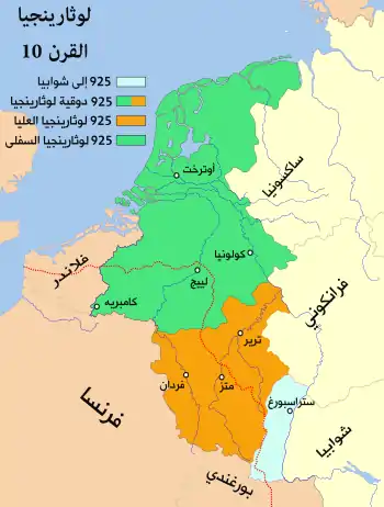 - جزء من مملكة الفرنجة الشرقيون بعد عام 939، انقسمت إلى دوقية لورين (كجزء من مملكة الفرنجة الغربيين) ولورين المنخفضة (كجزء من مملكة الفرنجة الشرقيون) في 959.