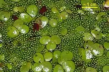 Wolffia arrhiza and Spirodela polyrhiza (the larger plant)
