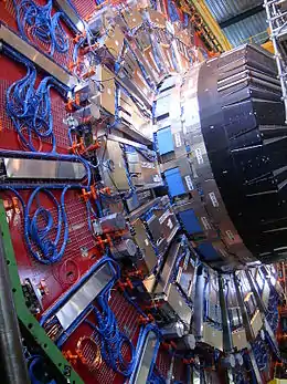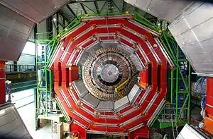 مقطع في منتصف المكشاف يبين طبقات العدادات المختلفة المستخدمة لقياس خواص الجسيمات الناتجة عن اصطدام بروتونين. نصف قطر المكشاف 5و7 متر. وترى نماذج لمسارات الجسيمات المختلفة منحنية تحت تأثير المجال المغناطيسي المسلط عليها في المكشاف.
