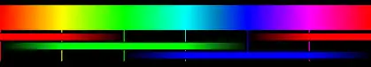 ملحوظة: المقارنة القادمة تتطلب نظام عرض رقمي (غالبا، جهاز حاسوب محمول، أو شاشة LCD متصلة مع DVI) لتفادى الأخطاء التي قد تحدث بين الاستجابة للترددات ومنحنيات جاما. قارن مدى رؤية لألوان GRB الأساسية والفرعية مع خلفية بيضاء.