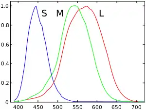 شبكية العين البشرية تحتوى على ثلاث أنواع خلايا مختلفة يمكن أن تلاحظ اللون أو خلية المخروط (بالشبكية). نوع منهم مختلف نسبيا عن النوعين الأخرىن، ويستجيب أكثر للضوء البنفسجي الذي نستقبله، والذي له طول موجي يتراوح حول 420 نانو متر (الخلايا المخروطية من هذا النوع يطلق عليها أحيانا خلايا الطول الموجي القصير، خلايا مخروطية S، وأحيانا الخلايا المخروطية الزرقاء). النوعين الأخرىن متقاربين جينيا، وكيميائيا وفي الاستجابة أيضا، وكلاهما يكون حساس للون الأخضر أو المخضر. أحد هذين النوعين (يسمى أحيانا خلايا الطول الموجي الطويل، خلايا مخروطية L، وأحيانا الخلايا المخروطية الحمراء) وهي حساسة للضوء الذي نحسه كأصفر أو أصفر-مخضر، وله طول موجي حول 564 نانو متر. النوع الآخر (يسمى أحيانا خلايا الطول الموجي المتوسط، خلايا مخروطية M، وأحيانا الخلايا المخروطية الخضراء) وتكون حساسة للضوء الذي نحسه كأخضر، وله طول موجي حول 534 نانو متر. المصطلح "الخلايا المخروطية الحمراء" للخلايا التي تحس بالأطوال الموجية الطويلة لا يفضل استخدامه نظرا لأن هذا النوع يستجيب كحد أقصى للضوء الذي نستقبله كمخضر، بالرغم من أن الطول الموجي للضوء الأطول من ذلك والذي آخر مداه أن يثير الخلايا متوسطة الطول الموجي \ "الخضراء".