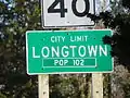 بلغ عدد سكان لونغتاون 102 نسمة بحسب تعداد عام 2010، وبلغ عدد الأسر 39 أسرة وعدد العائلات 30 عائلة مقيمة في القرية. في حين سجلت الكثافة السكانية 784.6 نسمة لكل ميل مربع (302.9/كم2). وبلغ عدد الوحدات السكنية 47 وحدة بمتوسط كثافة قدره 361.5 لكل ميل مربع (139.6/كم2). وتوزع التركيب العرقي للقرية بنسبة 99.02% من البيض. بلغ عدد الأسر 39 أسرة كانت نسبة 33.3% منها لديها أطفال تحت سن الثامنة عشر تعيش معهم، وبلغت نسبة الأزواج القاطنين مع بعضهم البعض 74.4% من أصل المجموع الكلي للأسر، وكانت نسبة 2.6% من الأسر لديها معيلون من الذكور دون وجود زوجة، وكانت نسبة 23.1% من غير العائلات. تألفت نسبة 23.1% من أصل جميع الأسر من أفراد ونسبة 2.6% كانوا يعيش معهم شخص وحيد يبلغ من العمر 65 عاماً فما فوق. وبلغ متوسط حجم الأسرة المعيشية 3.07، أما متوسط حجم العائلات فبلغ 2.62. بلغ العمر الوسطي للسكان 36.7 عاماً. وكانت نسبة 26.5% من القاطنين تحت سن الثامنة عشر، وكانت نسبة 2.8% بين الثامنة عشر والأربعة وعشرون عاماً، ونسبة 31.3% كانت واقعةً في الفئة العمرية ما بين الخامسة والعشرون حتى والأربعة وأربعون عاماً، ونسبة 26.5% كانت ما بين الخامسة والأربعون حتى الرابعة والستون، ونسبة 12.7% كانت ضمن فئة الخامسة والستون عاماً فما فوق. وتوزع التركيب الجنسي للسكان بنسبة 50.0% ذكور و50.0% إناث.[7]