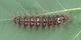 اليرقات هي نفسها خفية للغاية، تمزج ضد لحاء الأشجار، حيث تجمّع اليرقات عادة. اليرقات، مثل معظم الهمليوزينات، مغطاة بشعر مشذب، ولكن هذه اليرقات تمتلك سمعا فريدا مضاد للتخثر.