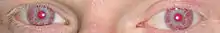تظهر أعين بعض الأشخاص المصابين بشدة بمرض المهق تحت ظروف ذوئية معينة نتيجة لوجود كميات منخفضة جداً من الميلانين،[81] والتي تؤدي إلي ظهور الأوعية الدموية من خلال القزحية.[82][83]