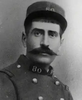 ![]() A black and white portrait photo of a man in French Army fatigues wearing a cap بارثاس في عام 1914 | ||||