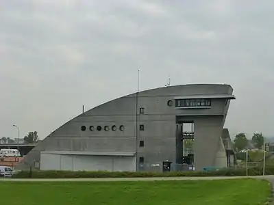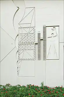 لقد قدم لو كوربوزييه تصميما حداثيا وظف فيه آخر الإنجازات التقنية في مجال الخرسانة المسلحة والمنشآت المعدنية. وقد ظهر ذلك جليا في طريقة سقف قاعات المدرجات الرئيسية الضخمة التي تكونت من سطح مستمر من العناصر التغليفية الخفيفة المتعلقة بأطرافها العلوية إلى مجموعة من الجسور الخرسانية الضخمة بواسطة كابلات من الألياف المعدنية القوية. وقد تعلقت الجسور الخرسانية الضخمة في ناحية منها على قوس خرساني مسلح ضخم له شكل القطع المكافئ، الذي يشبه أشكال مرائب الطائرات التي صممها رائد الخرسانة المسلحة المهندس الفرنسي يوجين فريزنيه في مطار أورلي بالقرب من باريس عام 1916. وقد اتخذت المسقط الأفقي للقاعات الرئيسية شكلا قطاعيا يوحي بأشكال الأصداف البحرية التي كان لو كوربوزييه شديد الإعجاب بها، وتؤكد الواجهات على قوة تلك الاستعارة إذ توحي هي أيضا بأشكال شبيهة بأشكال الحيوانات البحرية الصدفية. وقد شكل الجدار القطاعي الضخم المغلق الذي يواجه الصاعدين نحو مدخل المدرج الرئيسي خلفية نحتية مناسبة للساحة الاحتفالية المتكونة بين المدرجين الرئيسين.