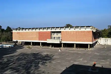 أما ثالث هذه المباني فهو المبنى الذي يضم المجالس التشريعية المحلية (البرلمان)، وهو قصر الاجتماعات (قصر النواب)، والذي يحتوي قاعتين رئيستين، واحدة لمجلس الأعيان، والأخرى لمجلس النواب.[56] وقد عبر لو كوربوزييه عن كل مجلس من المجلسين المذكورين بسقف مميز لكل منهما يبرز عاليا فوق سطح الصندوق البسيط الذي يشكل قاعدة المبنى. وقد جاء سقف قاعة مجلس النواب على شكل هرم رباعي مائل قليلا، أما سقف قاعة مجلس الأعيان فقد جاء أعلى كثيرًا وبشكل أسطواني ذي مقطع جانبي على هيئة القطع المكافئ، شبيه بأبراج التبريد التي تستخدم في المفاعلات النووية، ويبدو وكأنه يخترق السقف كمدخنة عملاقة يمكن رؤيتها عن بعد بكل وضوح. أما الواجهة الرئيسية للمبنى، المطلة على مبنى البرلمان المقابل لها، فقد تميزت برواق ضخم يتشكل من مجموعة من الدعامات الرفيعة Short walls as columns تحمل فوقها سقف الرواق الذي تميز بشكله الانسيابي المنحني.[57] وتعمل تلك العناصر مجتمعة على تكوين مجموعة من الظلال على واجهات المبنى والحجوم المميزة لقاعتي مجلس النواب ومجلس الأعيان، فتبدو في شمس الهند الحارة أبلغ تعبير عن إحدى أشهر مقولات لو كوربوزييه في تعريفه للعمارة بأنها "اللعب المتقن الرائع في مجموعة من الكتل ترى تحت الضوء".[58][59][60]
