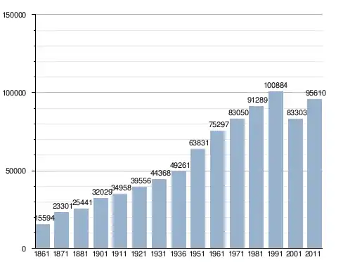 في سنة 1861 بلغ عدد السكان 15٬594 نسمة، وتطور العدد ليصل في سنة 2011 لـ 95٬610 نسمة.