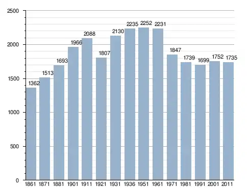في سنة 1861 بلغ عدد السكان 1٬362 نسمة، وتطور العدد ليصل في سنة 2011 لـ 1٬735 نسمة.