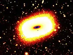 ![]() تتميز هذه المجرة بشكلها المستطيل الغريب، وهي أول مجرة تكتشف لها هذا الشكل. وقد عولجت هذه الصورة ذات الألوان الكاذبة لتظهر شكل المجرة بوضوح | |
