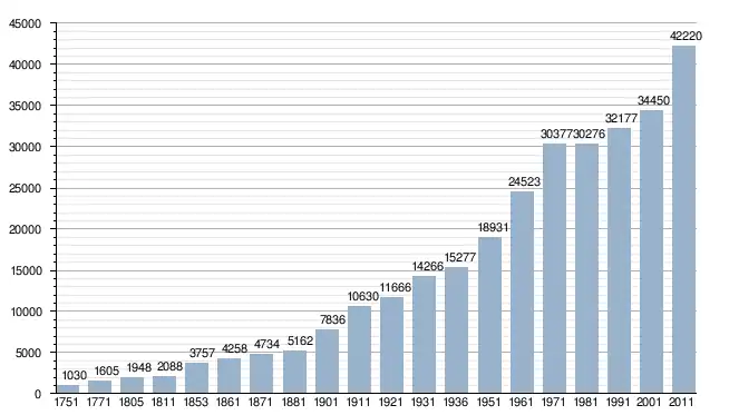 في سنة 1751 بلغ عدد السكان 1٬030 نسمة، وتطور العدد ليصل في سنة 2011 لـ 42٬220 نسمة.