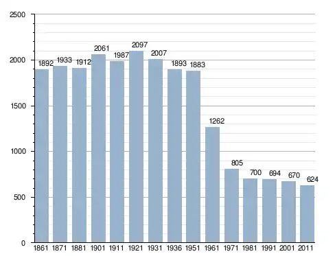 في سنة 1861 بلغ عدد السكان 1٬892 نسمة، وتطور العدد ليصل في سنة 2011 لـ 624 نسمة.
