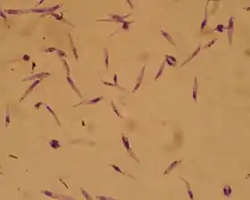 ![]() الشكل السوطي لطفيليات الليشمانيا الكبيرة. تلوين غيمزا، التكبير 10×100. | |