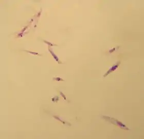 ![]() الشكل السوطي لطفيليات الليشمانيا المدارية. تلوين غيمزا، التكبير 10×100. | |