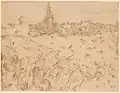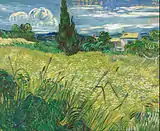 ![]() A painting of a scene at night with 11 swirly stars and a bright yellow crescent moon. In the background there are hills, in the middle ground there is a moonlit town with a church that has an elongated steeple, and in the foreground there is the dark green silhouette of a cypress tree. | ||||