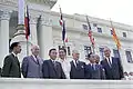 جونسون مع الرؤساء كل من رئيس فيتنام الجنوبي نغوين كاو كي وهارولد هوت رئيس الوزراء الأسترالي ورئيس كوريا الجنوبية بارك شونغ-هي والرئيس الفلبيني فرديناند ماركوس وثانوم كيتيكاشورم وزير الدفاع التايلندي ونغوين فان ثيو من فيتنام الجنوبية ورئيس وزراء نيوزلندا كيث هوليوك.
