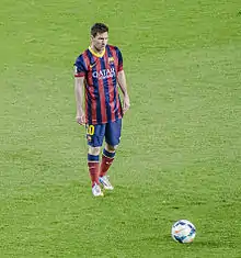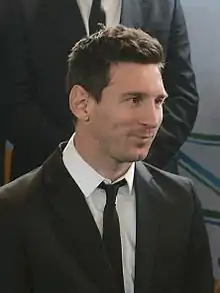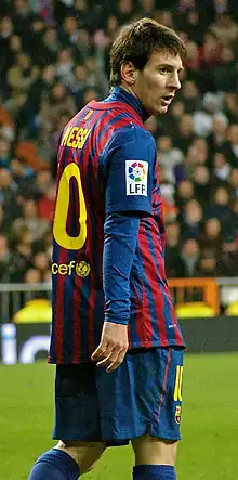 ليونيل أندريس ميسي كوتشيتيني (تلفظ بالإسبانية: /ljoˈnel anˈdɾez ˈmesi/؛[8] مواليد 24 يونيو 1987) هو لاعب كرة قدم أرجنتيني يلعب مهاجمًا وقائدًا لكل من نادي برشلونة والمنتخب الأرجنتيني. غالبًا ما يُعتبر أفضل لاعب في العالم[9][10][11] ويعتبره الكثيرون من أعظم اللاعبين في تاريخ كرة القدم،[12][13][14][15][16][17] وقد فاز ميسي بستة جوائز من الكرة الذهبية،[note 1] وهو صاحب الرقم القياسي بستة أحذية ذهبية أوروبية. قضى كامل مسيرته الاحترافية مع برشلونة، حيث فاز بـ33 لقبًا مع النادي، بما في ذلك عشرة ألقاب في الدوري الإسباني، وأربعة ألقاب في دوري أبطال أوروبا، وستة ألقاب في كأس الملك. يعتبر ميسي هدافًا وصانع ألعاب إبداعي، ويحمل الأرقام القياسية لأكثر عدد من الأهداف في الدوري الإسباني (463)، وأكثر لاعب سجل في موسم الدوري الإسباني وأي دوري أوروبي آخر (50)، وأكثر من سجل هاتريك في الدوري الإسباني (36) ودوري أبطال أوروبا (8)، وأكثر من مرر تمريرات حاسمة في الدوري الإسباني (187)، وأكثر من مرر تمريرات حاسمة في الدوري وأي دوري أوروبي آخر (21)[20] وأكثر من مرر تمريرات حاسمة في كوبا أمريكا (12). وقد سجل أكثر من 750 هدف رسمي مع النادي والمنتخب.