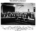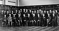 | الصف في الوسط (من اليسار إلى اليمين):بيتر ديباي، مارتن كنودسن، وليم لورنس براغ، هندريك أنتوني كرامرز، بول ديراك، آرثر كومبتون، لويس دي بروي، ماكس بورن، نيلز بور. |