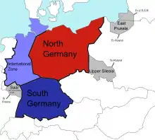 خطة مورغنثاو:الدولة الألمانية الشماليةالدولة الألمانية الجنوبيةمناطق خسرتها ألمانيا (سارلاند حتى فرنسا، سيليزيا العليا حتى بولندا، بروسيا الشرقية، قسمت بين بولندا والاتحاد السوفيتي)