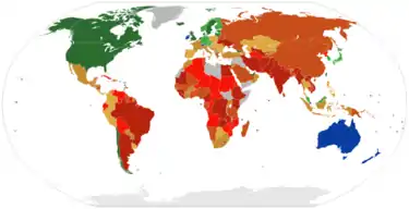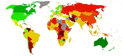 مفتاح: ██ حرة (80–100) ██ حرة في الغالب (70–79.9) ██ حرة في المتوسط (65–69.9) ██ غير حرة في المتوسط (60–64.9) ██ غير حرة في الغالب (55–59.9) ██ غير حرة في الغالب (50–54.9) ██ مقموعة (0–49.9)