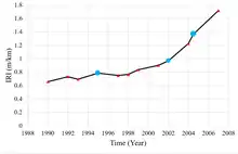 مؤشر الخشونة الدولية (بالإنجليزية: International Roughness Index) أو أي أر أي (بالإنجليزية: IRI) هو مؤشر الخشونة الأكثر شيوعًا، يتم الحصول عليه من قياس المقاطع الطولية للطرق. يتم حسابه باستخدام نموذج رياضي لربع مركبة، حيث يتم تجميع استجابته للحصول على مؤشر خشونة مع وحدات منحدر (في in/mile و m/km).[1] يحتوي مقياس الأداء هذا على قدر أقل من العشوائية وعدم الموضوعية بالمقارنة مع مؤشرات أداء الرصيف الأخرى، لكنه لا يخلو تمامًا من العشوائية. تكمن مصادر التباين في بيانات IRI في الفرق بين قراءات التشغيلات المختلفة لمركبة الاختبار والفرق بين قراءات مسارات العجلات اليمنى واليسرى.[1] على الرغم من هذه الحقائق، منذ تقديمه في عام 1986،[2][3][4] أصبح IRI مؤشر خشونة الطريق الأكثر استخدامًا في جميع أنحاء العالم لتقييم وإدارة أنظمة الطرق.[5]