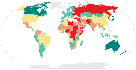 خريطة العالم لمؤشر السلام العالمي 2018. البلدان الأكثر اخضراراً مصنفة على أنها أكثر مسالمة، البلدان الأكثر احمراراً مصنفة على أنها أقل مسالمة.