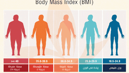 | سمنة مفرطة (سمنة من الدرجة الثالثة) | أكثر من 40 |