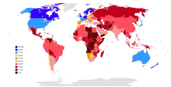 في آخر إصدار لمؤشر الفساد في عام 2019، والذي نشر في بداية عام 2020؛[4] اعتبرت كل من الدنمارك ونيوزيلندا وفنلندا على أنها أقل الدول فسادًا في العالم، حيث تحتل مرتبة عالية باستمرار بين الشفافية المالية الدولية، في حين أن أكثر الدول فسادًا في العالم هي الصومال، حيث سجلت 8-10 من أصل 100 منذ عام 2012..[5] يُنظر إلى جنوب السودان أيضًا على أنه واحد من أكثر الدول فسادًا في العالم بسبب الأزمات الاجتماعية والاقتصادية المستمرة، حيث حصل على معدل 13 من أصل 100 في عام 2018.[6]