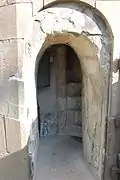 على قاعدة البرج، يتجول صف من حقول المرآة بنمط قزم متكرر ذي حدين. يقع مدخل المئذنة على الجانب الشمالي من القاعدة. لم يكن في الأصل خارجيا ولكن المدخل كان في داخل المسجد. مدخل البرج مغلق بشكل نصف دائري. المساحة الداخلية صغيرة مع درج حجري ضيق حاد يؤدي إلى الشرفة. تحتوي الشرفة على باب بإغلاق نصف دائري، يشبه المدخل. مدخل الشرفة مواجه لاتجاه مكة.[4]
