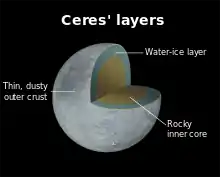 تشير الدرسات إلى احتمال وجود طبقة داخلية رطبة على الكوكب القزم سيريس ، أكبر جسم في حزام الكويكبات وتوحي عملية انبعاث بخار الماء من سطح سيريس إلى تسامي جليد السطح[45][46]