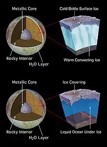 ويعتقد أن طبقة من المياه السائلة سميكة بما فيه الكفاية لفصل القشرة عن الوشاح موجودة على القمر تيتان وايضا على كاليستو وغانيميد [44] وترايتون.[47][48] وقد يكون لدى معظم الأقمار الجليدية الأخرى محيطات داخلية، أو محيطات داخلية قد جمدت الآن.[44]