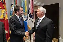 كما أيد سالفيني المرشح الجمهوري في انتخابات الرئاسة الأمريكية لعام 2016، دونالد ترامب، الذي التقى به في أبريل 2016 في فيلادلفيا.[79] وشبهت وكالات أنباء متعددة وجهات نظره بآراء ترامب.[80][81] في سبتمبر 2018، تعهد سالفيني بدعمه لـ"الحركة"، وهي مجموعة شعبوية أوروبية أسسها ستيف بانون كبير الاستراتيجيين السابقين لترامب.[82]