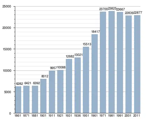 في سنة 1861 بلغ عدد السكان 6٬282 نسمة، وتطور العدد ليصل في سنة 2011 لـ 22٬877 نسمة.