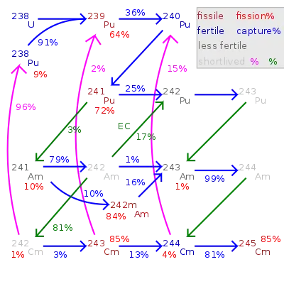 بعض الدول الأخرى الأكتينيدات تحتاج أكثر من واحد أسر النيوترون قبل التوصل إلى النظير الذي هو على حد سواء الانشطارية وطويلة الأمد بما يكفي لتكون على الأرجح قادرة على التقاط آخر النيوترونات والانشطار بدلا من المتحللة.