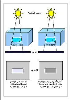 تستخدم المواد المظللة في التشخيص الطبي، لتشخيص تغيرات تحصل في أعضاء معينة في الجسم كالأوعية الدموية مثلاً التي هي في حالتها الطبيعية ممتلئة بالدم، الذي له كثافة إشعاعية مشابهة لكثافة النسيج المحيط (عضلات أو أنسجة رابطة) وبالتالي لا يمكن رؤية الأوعية الدموية على صورة الأشعة. فيتم حقن المادة الملونة في هذه الأوعية الدموية، مما يرفع الكثافة الشعاعية للمحتوى الوعاء الدموي ـ هنا على سبيل المثال ـ ويجعل محتوى هذا الوعاء ومساره واضحاً. كما هو مبين في الصورة التي تظهر القسطرة. وهذا المبدأ يمكن استخدامة في إظهار محتويات كثير من "الأوعية" في جسم الإنسان، مثل الجهاز الهضمي أو المثانة والمجاري البولية... الخ.