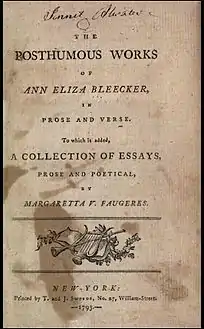 - Faugeres, Margaretta V. (1793). The Posthumous Works Of Ann Eliza Bleecker. New York: T.and J. Swords. صفحات 1–19. مؤرشف من الأصل في 24 نوفمبر 2016. الوسيط