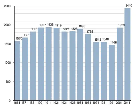 في سنة 1861 بلغ عدد السكان 1٬570 نسمة، وتطور العدد ليصل في سنة 2011 لـ 2٬440 نسمة.